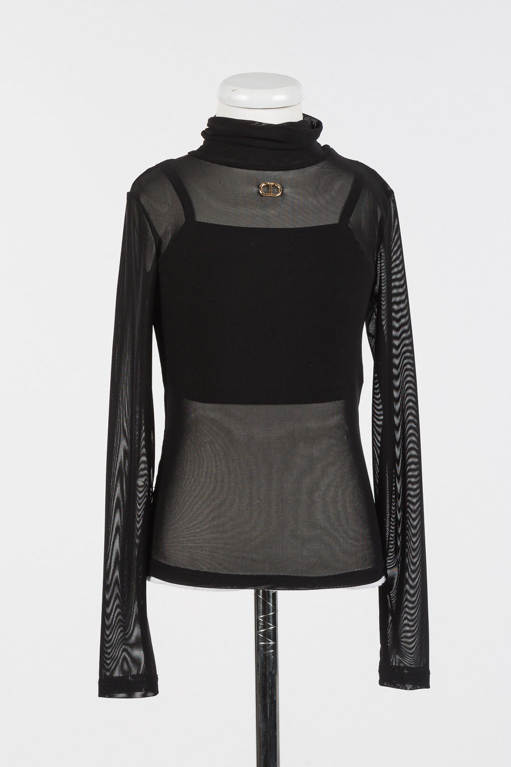 Top da bambina in tulle con collo a lupetto, maniche lunghe, logo Oval T in metallo davanti e linea dritta. È abbinato al top cropped in jersey di cotone con spalline sottili.