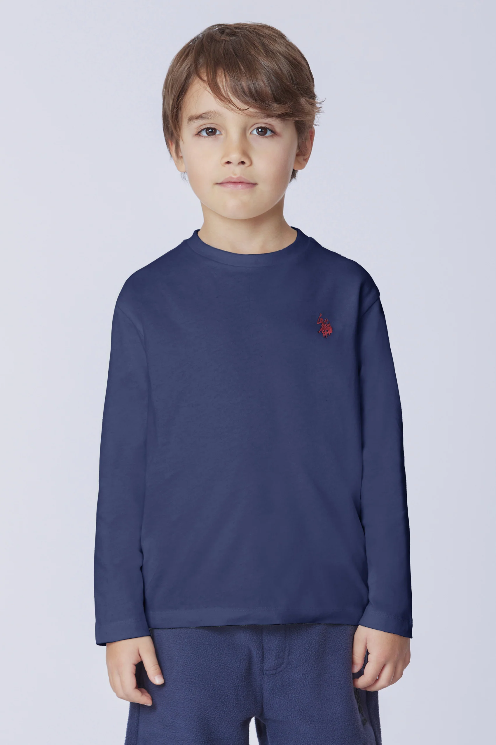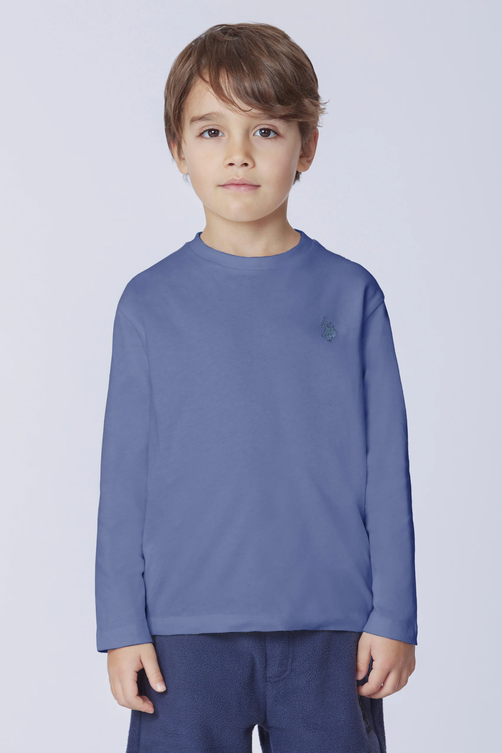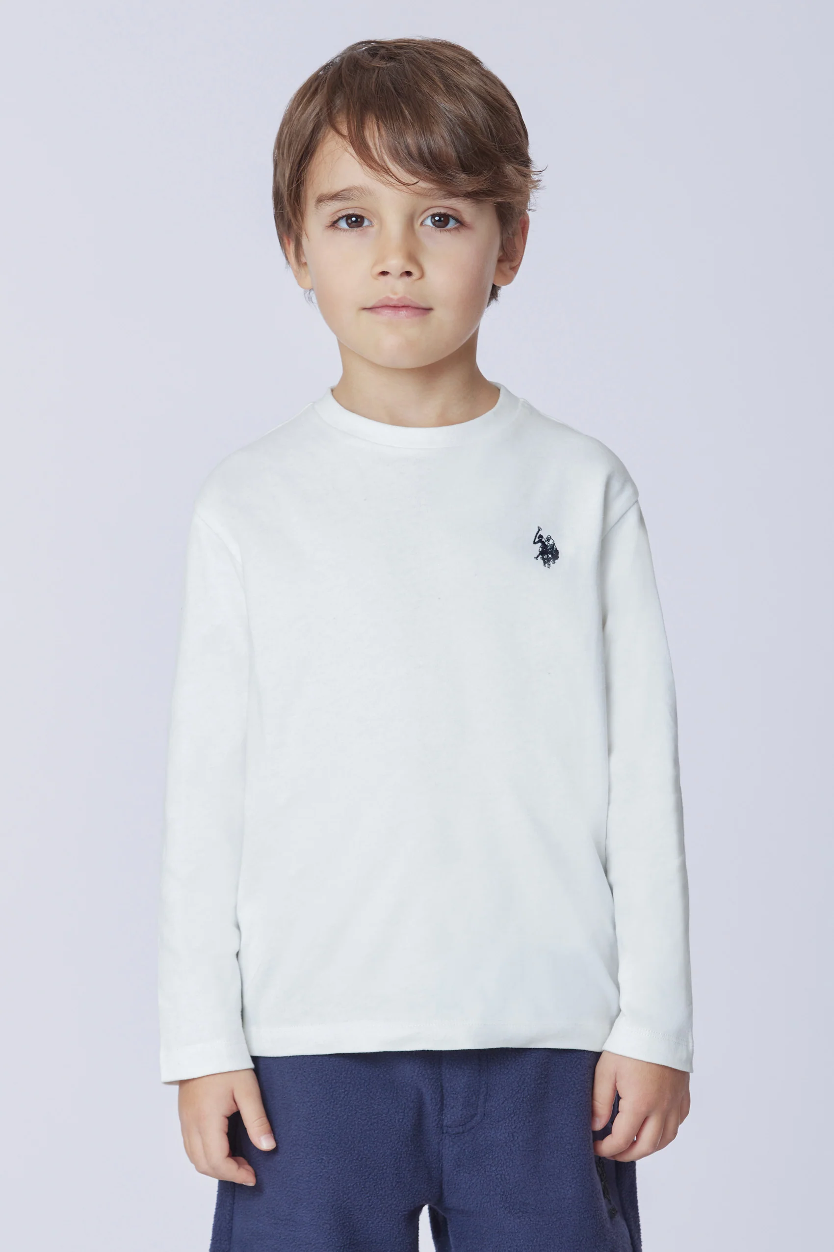 Descrizione: T-shirt girocollo a maniche lunghe da bambino in tessuto cotone jersey carbon finishing arricchita dal ricamo a filo del logo Double Horsemen lato cuore. Un capo dalle linee essenziali e versatile, perfetto per creare look casual e pratici.