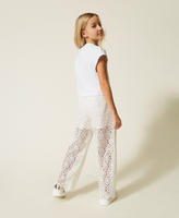 Descrizione: Pantaloni da bambina in pizzo macramè a motivo geometrico. Ha chiusura con zip e bottone, tasche alla francese, fodera shorts in mussola di cotone, fondo smerlato, linea ampiaLavare a mano, Non trattare con cloro, Non usare asciugatrice, Stirare a temperatura massima 110 °C, Non lavare a secco, Asciugare appeso gocciolante in ombra