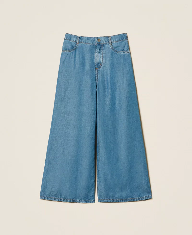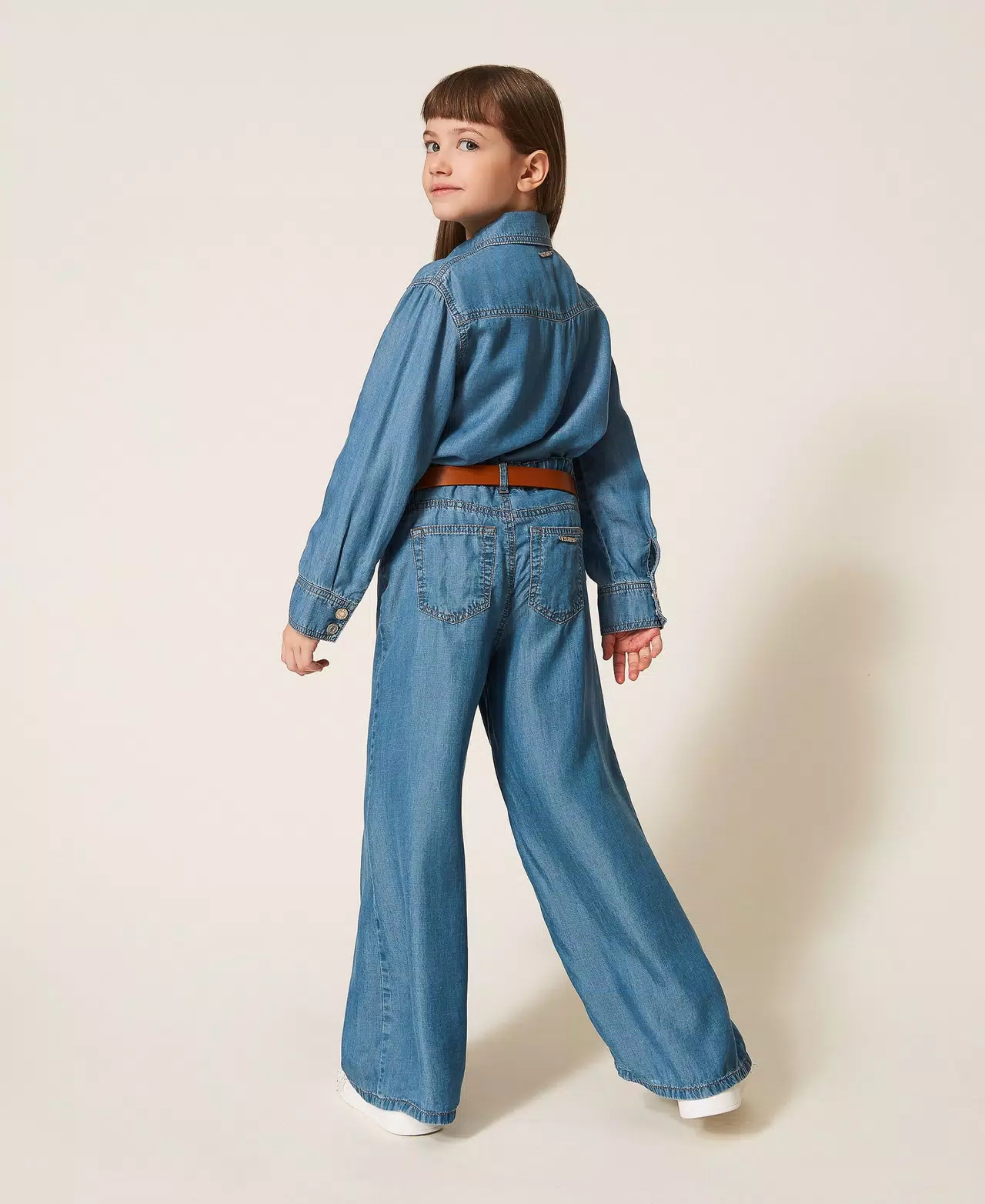 Jeans da bambina in chambray con zip e bottone logato, tasche alla francese davanti e applicate sul retro, cintura rimovibile abbinata, linea ampia.