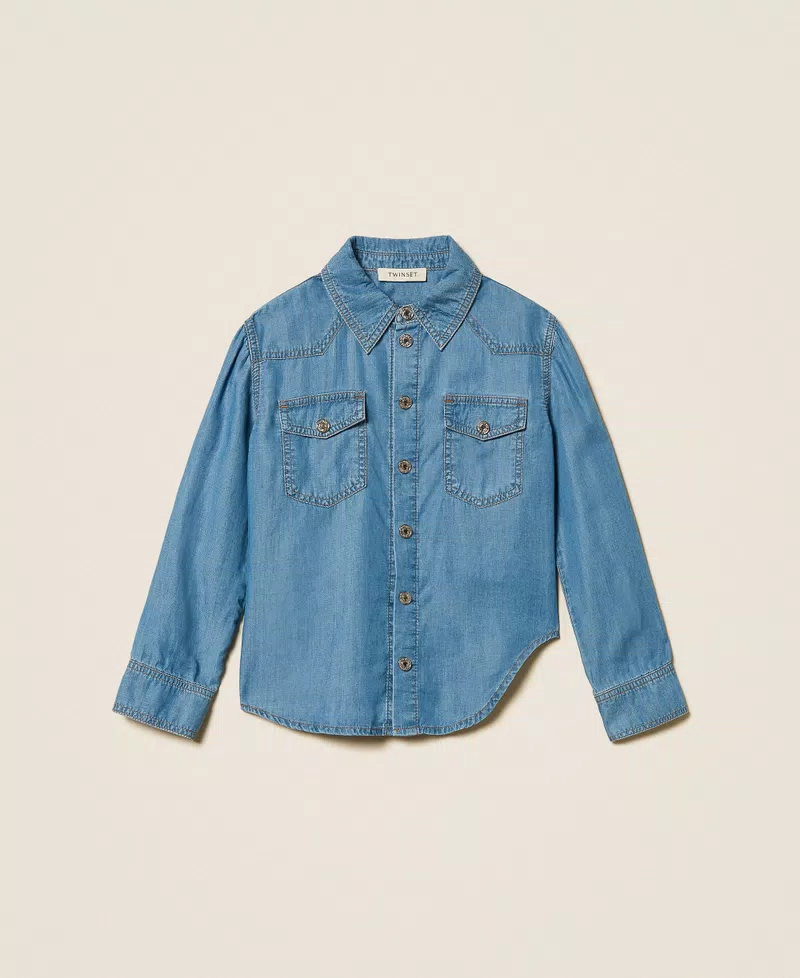 Camicia da bambina in chambray con bottoni a pressione logati. Ha maniche lunghe con polsino e bottone, tasche con patta davanti, taglio carré a punta sulle spalle, impunture color tabacco, linea dritta.