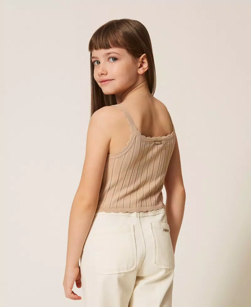 Top da bambina in maglia di viscosa stretch con lavorazione a costa piatta. Ha collo tondo, apertura a goccia davanti, profili rifiniti da smerli, placchetta logo in metallo sul retro, linea fitted.